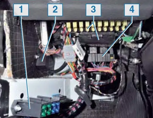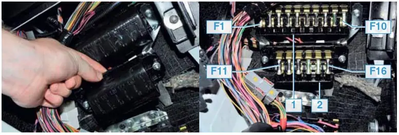 Большинство предохранителей и реле находятся в салоне под панелью.